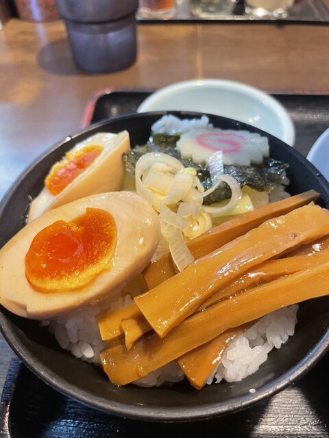 ライスにネギとメンマ、玉子に海苔をのせスープをレンゲ1杯入れたオリジナルミニ丼