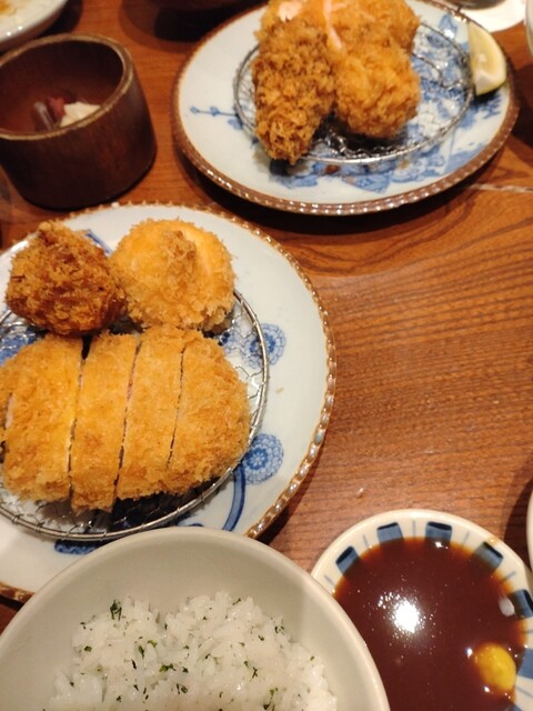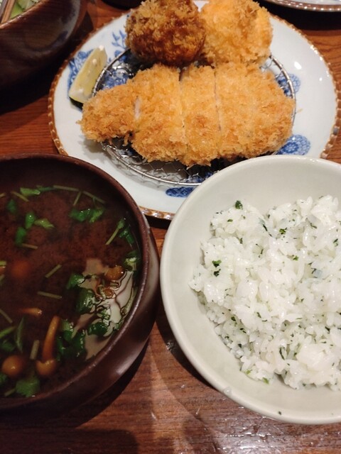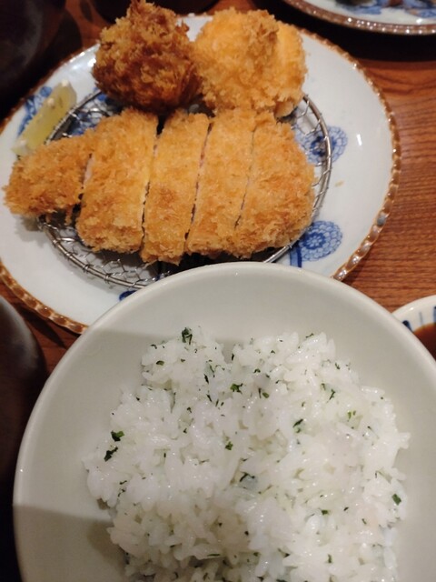 平日ランチで、サービスセットの牡蠣フライ、海老かつ、ロースを、漬物の種類が少なくなっていますが、サラダ(キャベツ多め)のおかわり無料やご飯、白米