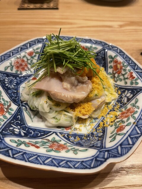 温かい素麺に蛤、その上に雲丹とカラスミ