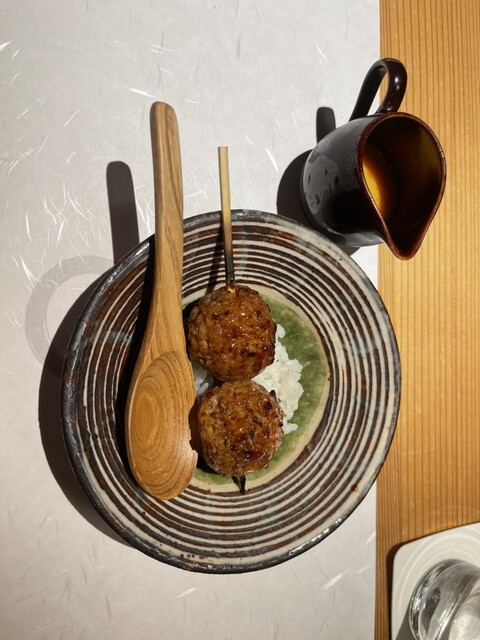 〆の鶏つくねご飯は別添えの生卵黄をくるっとかけて頂く