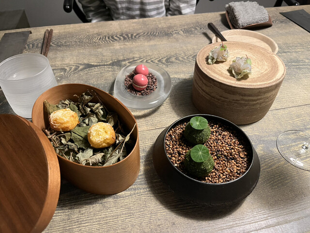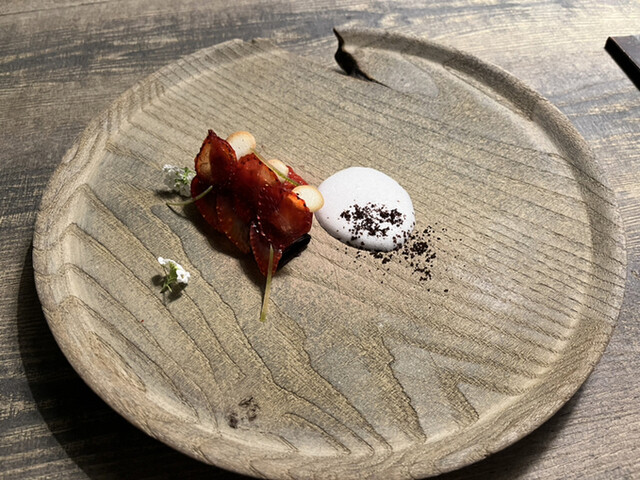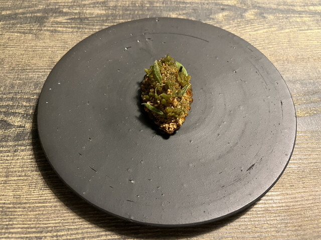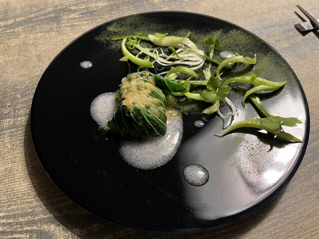 ・薪火の香り、菊芋、紫蘇オイル、吸盤、キャビア、自家製大葉のソース