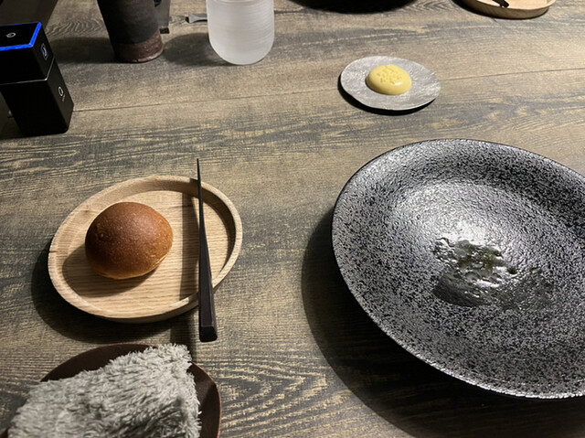 ・生ハムとアスパラの泡、卵黄ソース、熊脂、粉山椒