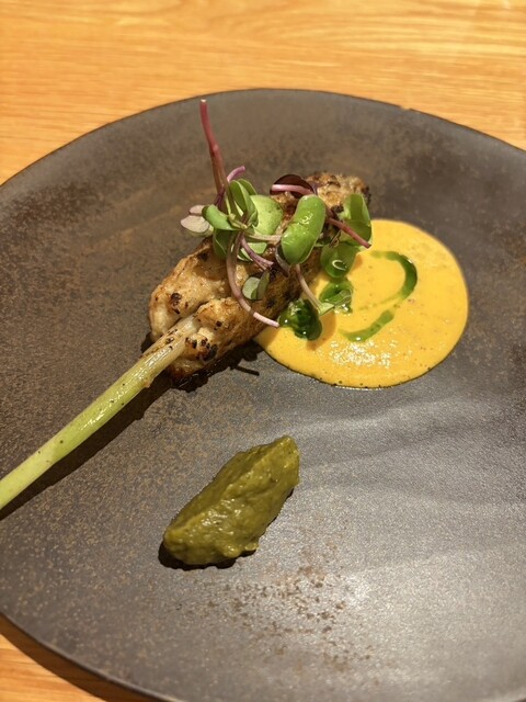 岩手県産のホロホロ鶏のサテ、万願寺唐辛子のソースがと葉生姜の組み合わせ…最高!