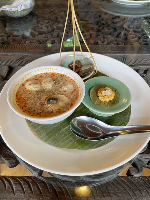 まず、前菜が到着。ピンチョスとスナックのようなものがトムヤムスープと共に運ばれてきました。
