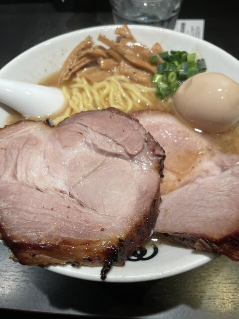 やや長め、10分ほどで着丼。極厚チャーシュー2枚とコシのある太麺、スープは魚介系で濃いめ、麺によく絡みます。