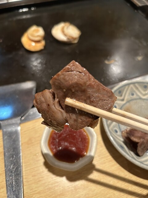 まず先付から始まり、鉄板焼盛合せが登場。国産牛カルビはジューシーで焼き加減もよく、大粒ほたては甘みが強くて印象的でした。いかゲソゴロ焼きは旨みが濃く、お酒が進む味。鉄板料理だけでも満足度が高いです。