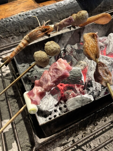 囲炉裏で具材を焼いて食べるスタイルで