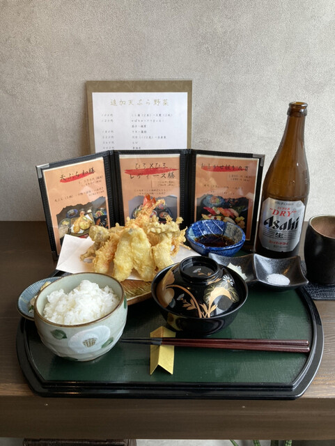 知立駅北口から5分くらい歩いて岐阜屋さんに着きました。あらかじめ電話で予約してあったので個室に通されます。床の間付きの畳のお部屋ですが、低めの椅子のテーブル席は膝に優しくて良いですね〜、花扇弁当(天ぷ...