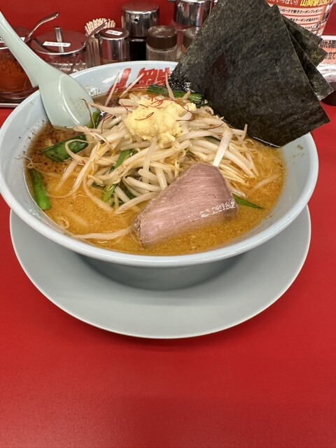 いつもの特製味噌にもやしとネギを追加で乗っていて上に生姜がのっています!