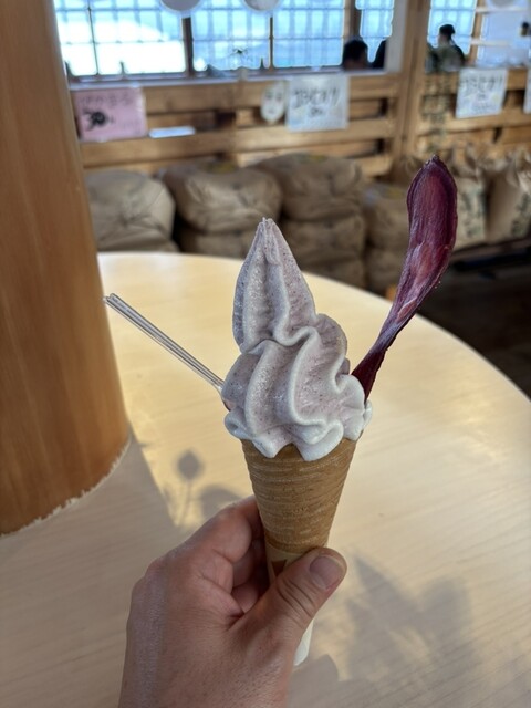 15時ごろ訪問。待ちなしだが、店内やや混雑。今回は紅芋ソフトを選択。とても大きな紅芋チップスが刺さっている。紅芋のパウダーがふんだんに使われていて、優しい風味がたまらない。ソフトの中間部にも沢山使用されていた。