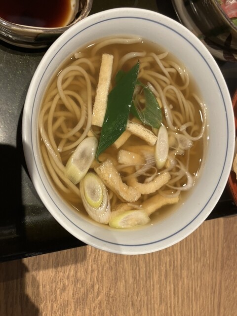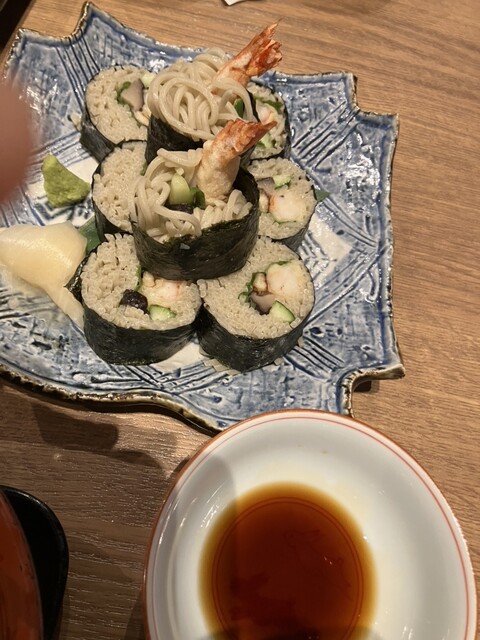 そばの太巻きは、そばのお出汁と醤油を混ぜたものにつけていただきます。海老天が中に入っているので、思った以上にボリュームがありました。