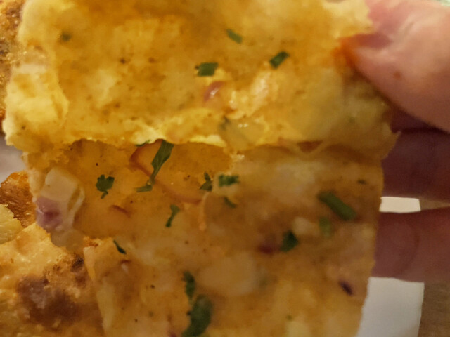 ・バーラ。ネワール族の伝統料理。豆をペースト状にして焼いたものだと思われる。パリッとしているが、中は少し粘り気がある。ほんのり苦味のあるビスケットみたい。
