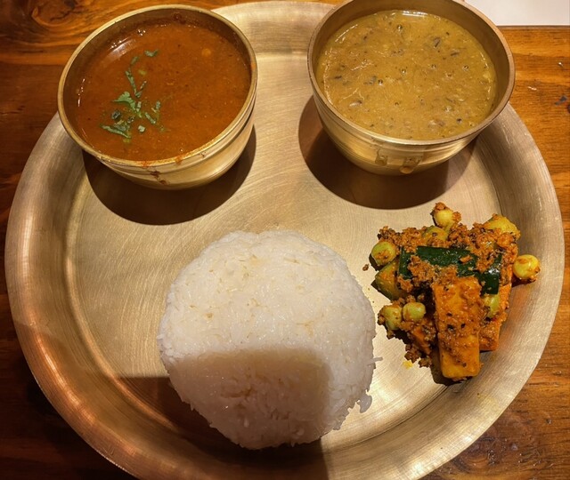 ネパールの一民族である"タカリ族”のダルバート(ネパール定食)である。ライス、ダル(豆のスープ)、チキンorマトンカレー、ミックスアチャール(漬物)、ライス。それらに加えて、タルカリ(野菜炒め)、サーグ(青菜炒め)、グンドゥルックのアチャール、チャトニ(スパイスソース)、生野菜スライス(きゅうりと人参)、パパド(豆せんべい)がついてくる。これらのおかずが真鍮色のプレートの上でライスを取り囲んでいる光景は、なんとも芸術的である。
