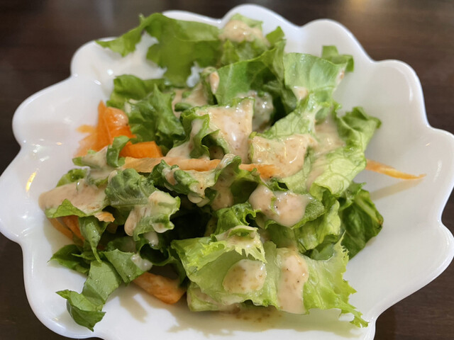 辛さは3.辛口で。サラダとソフトドリンク付き。珍しい緑茶を選べた。