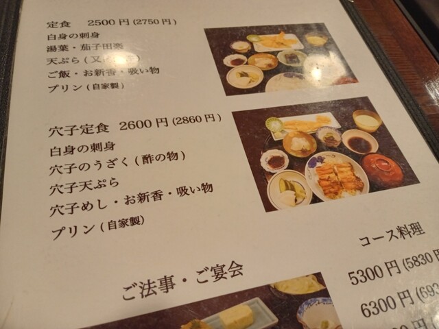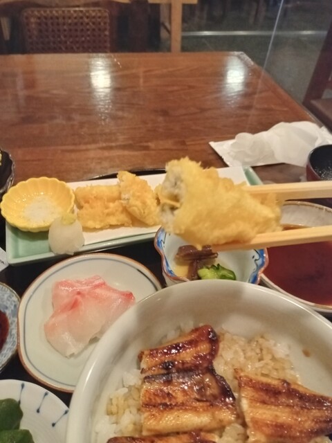 ・穴子の天婦羅 ・穴子丼 ・穴ざく ・タイ刺 ・お新香 ・吸い物 ・プリン(デザート) +天玉(玉子の天婦羅) 〆て¥3,025-