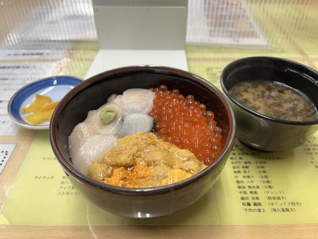 函館といえば朝市も有名。平日朝7:45頃に訪問しました。店内は満席だったので、5分ちょっと外で待ちました。1番オススメの元祖函館巴丼2728円を注文。ミニサイズもありますが、ここはレギュラーサイズで。テーブルには函館の知識が載っている紙が置いてあって時間を潰せました。注文してから10分ちょっとで着丼。ウニの臭みがなく、とろけるような美味しさ!もうちょっとウニが入っていればより嬉しい笑ホタテもプリプリ。イクラも美味しい!朝だから食べられるか少し心配でしたが、その心配も忘れあっという間に完食しました。最後まで美味しく大満足な朝ごはんでした。1人だったので相席になるかもしれないと言われましたが、相席にならず最後まで1人でした。