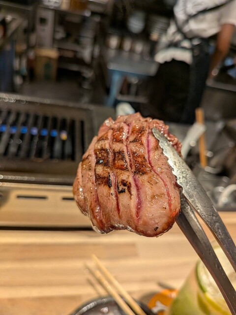 赤身塊ステーキは大きな塊の赤身肉を低温調理して表面をしっかり焼いたお肉です。切った時の断面はローストビーフのような綺麗な断面でそこにパセリ入のガーリックバターを削り出したものを添えています。口に運ぶとガーリックバターの風味が口の中で広がり、食欲を刺激されてますかんだ時の硬い部分と柔らかくジュワーっと脂を感じる部分がとても美味しいです。お好みで醤油をかけたり、レモンを搾っていただけます。個人的にはそのままで美味しいって思います。