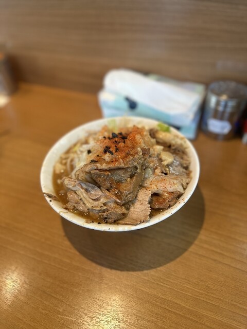 ラーメン(並)はデフォルトで肉マシになっていて、味付けも一味唐辛子などがかかっていて非常に食べやすかったです。また、卓上調味料もコショーと一味唐辛子があり豊富でした。味も甘すぎず、醤油も豚の旨みも感じられる味付けですごく大好きな味でした!