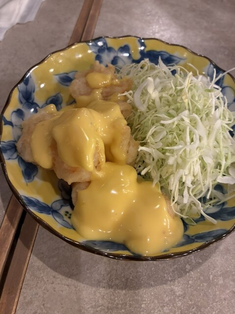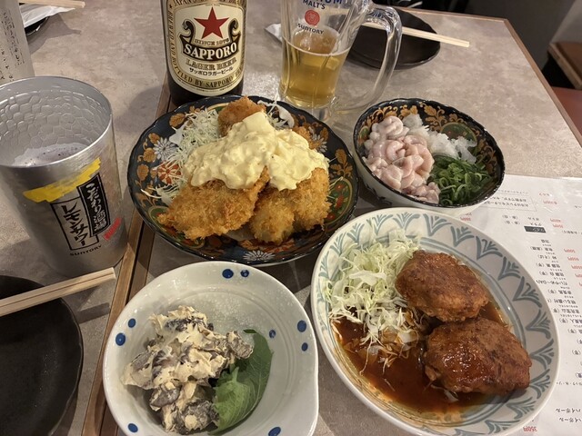 食べ物はご覧の通り、タラのタルタルフライ、白子ポン酢、つくねハンバーグ、いぶりがっこのクリームチーズ、れんこんのポテサラ(写真撮り忘れ)、カキのオイル炒め、エビマヨ、唐揚げ、まぐろの刺身、イカ焼きそば(写真忘れた。メニュー見て友達は何?人力焼きそばって言って大笑いした。)
