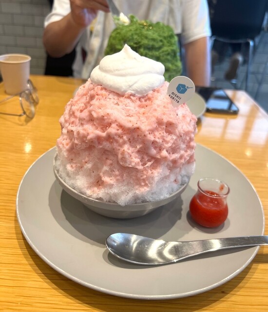 テーブルで待つ事5分ほどで美味しいそうなかき氷がきました♪奥さんはいちごミルク私はいつもの八女抹茶ミルクです。八女抹茶には中に餡子やらいろいろ入ってます。ふわふわ氷で口のですぐ溶けます、めちゃ美味しい〜‼️それから食べても食べても、頭キーンが全然ないんです!うちの奥さんも驚いております。また来たいと珍しく叫んでいました。やはり女性たちに人気のお店です。