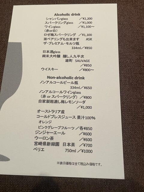 今日もいつものオヤジ2人のランチ飲みです。こちらのレストランを12:30で予約してます。初めての訪店です♪テーブル席が2席とL字のカウンター席が8席ほどあります。テーブル席に案内されました。¥4300のコースを予約済みです。