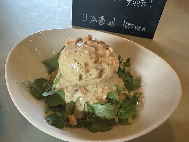 コクのある丸ごと半熟玉子を使ったウフマヨをパクチーやハーブの爽やかな香と共に。その香りに負けない、しっかりとした香りの白ワイン(ベルメンティーノ)との相性が抜群。