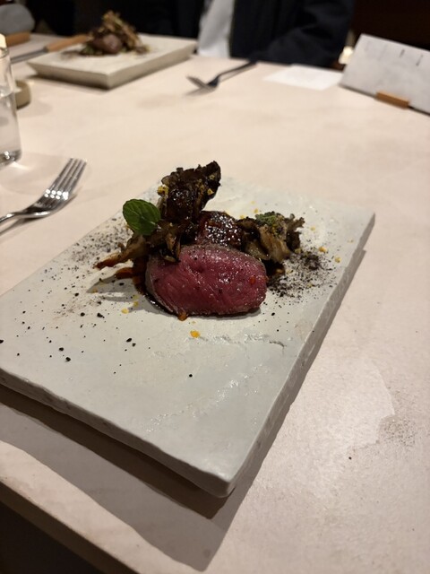 メインの薪焼き和牛は、ワインの酸と薪の香りが織りなす 、力強さの中に静謐を湛える一皿。シェフの情熱や人生が美しくダイレクトに皿の上で結晶しており、まるで芸術品のよう。