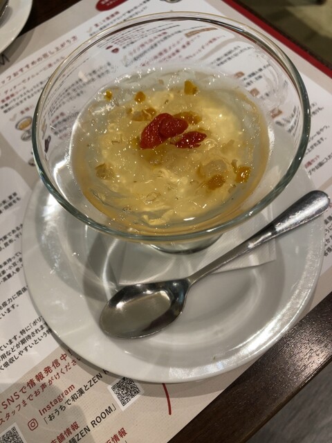 杏仁豆腐は、杏仁霜を使った本格的な味。白キクラゲ、クコ、陳皮が入った蜂蜜ジュレが乗っている。甘さはしっかりある感じです。