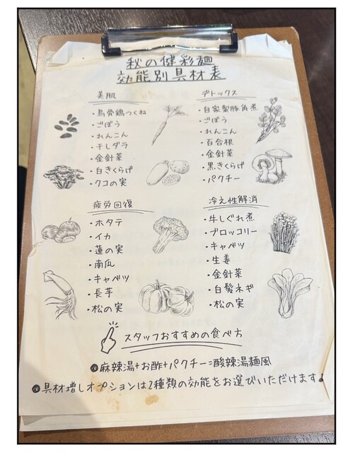 健彩麺はスープ、麺、具材で各好みのものを選べます。疲れが溜まっていたので、疲労回復スープ、米麺(平麺)、疲労回復の具材を選択しました。野菜食べたかったので具材増も追加。