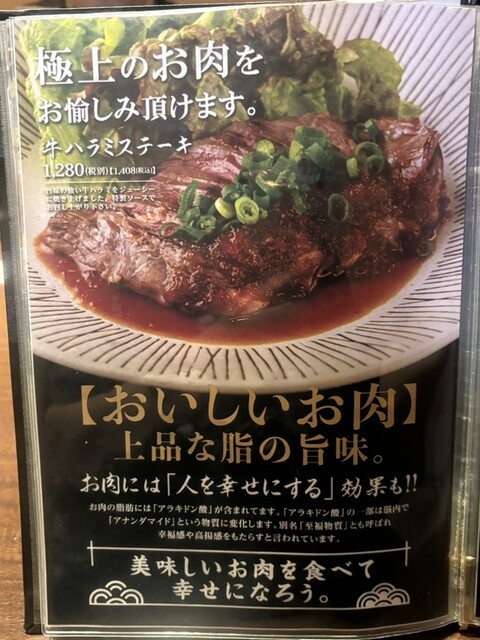 さらに牛ハラミステーキ(税込1408円)は柔らかくジューシーで食べ応え十分。ホルモンスパイス揚げ(税込748円)も外はカリッと中はプリッとした食感でおつまみにぴったりでした。締めに頼んだとろとろ明太チーズ出汁巻き玉子(税込858円)は、ふわふわの玉子に明太子とチーズのコクが加わり、美味しかった。