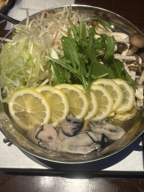 まずはアサヒスーパードライ生中ジョッキ(税込649円)で乾杯。キンキンに冷えていました。メインで頼んだレモン香る旨塩牡蠣鍋(1人前税込1958円)は、薄切りレモンの爽やかな香りが効いており、牡蠣の旨みと相性抜群。しめじ、水菜、キャベツ、ねぎ、もやしが入っており、