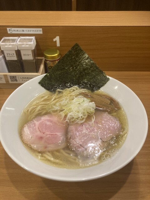 平日12時オープンで11時40分に到着、並び前3人。5分前にオープン。券売機で塩そば1,000円を注文。5分程で着丼。