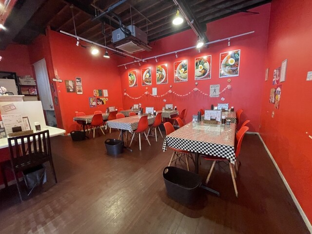 店内に入ると、思わず「レッズファンのお店?」と思うほど鮮やかな赤。壁一面が真っ赤でインパクト大です。