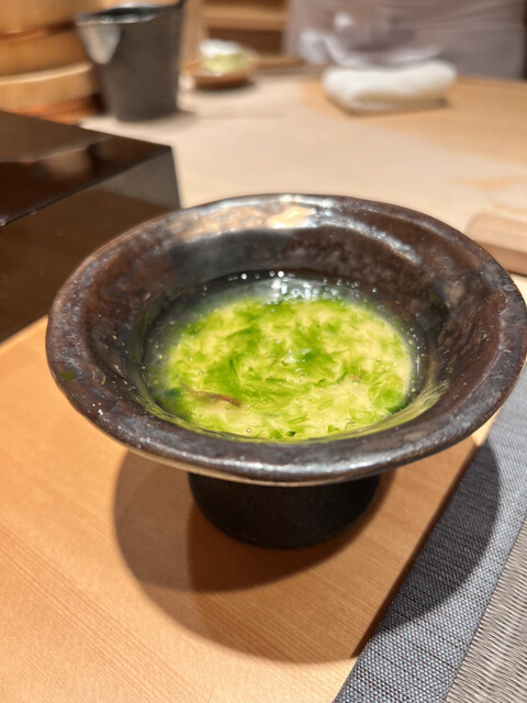餡かけのハモの卵が入ってる 上にはワサビを刻んだもの