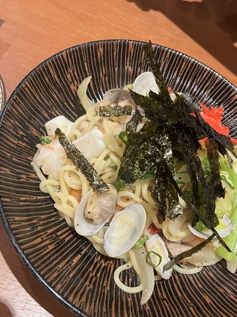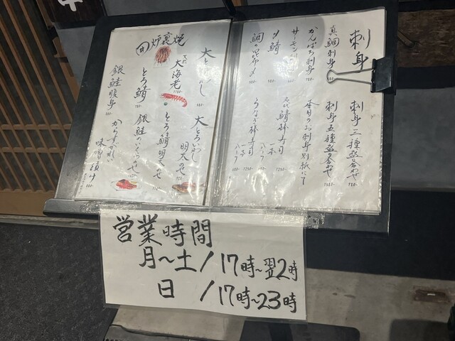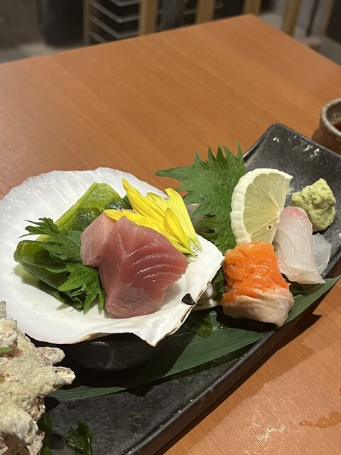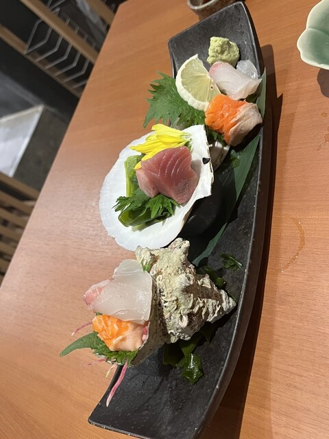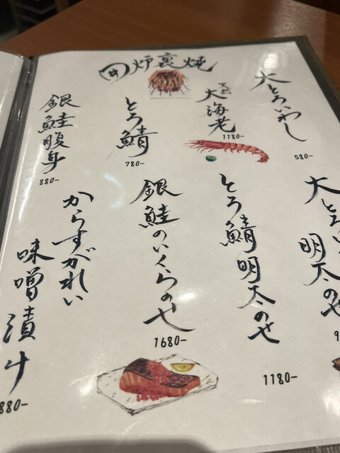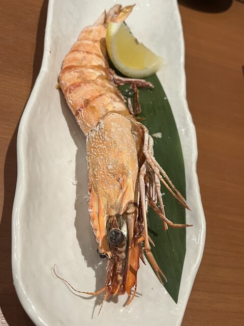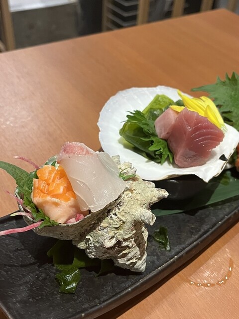 いわしの明太のせ、大海老、とろ鯖 の囲炉裏焼き、刺身3種盛り など 注文しました。