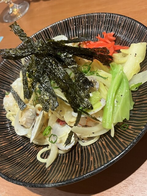 友人が 注文した 焼きそば。結構なボリューム です。 やや太めの麺 で 味付けは 塩メインでした。