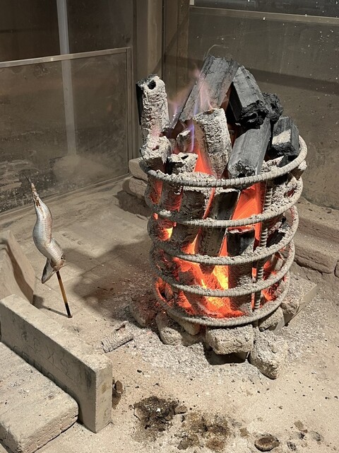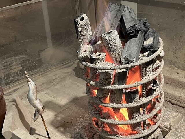囲炉裏での 焼く作業、店員さんに 断りを入れて、撮影させてもらいました。