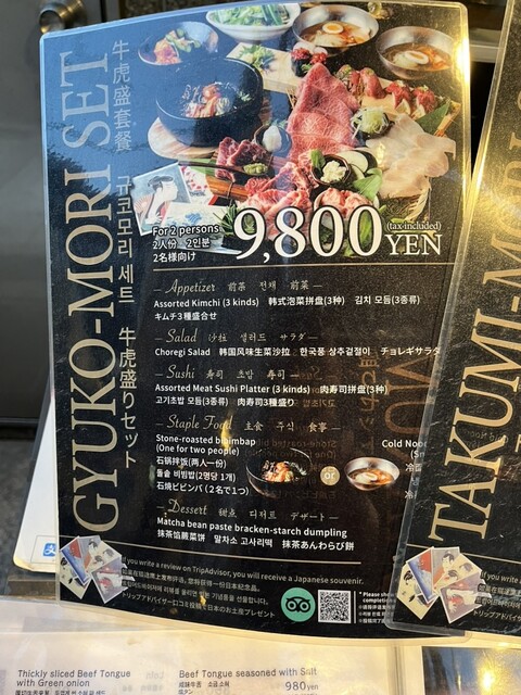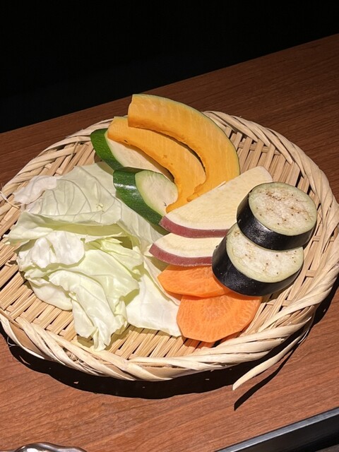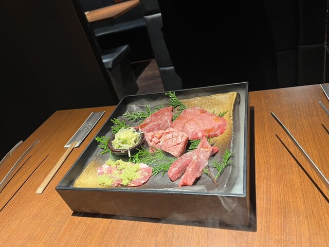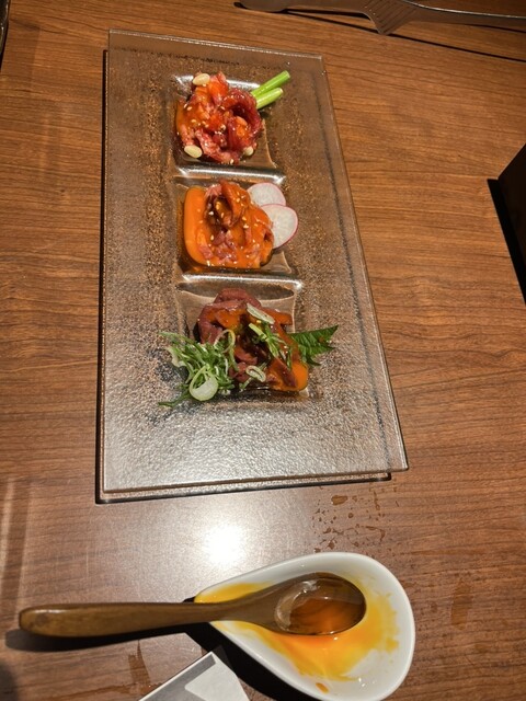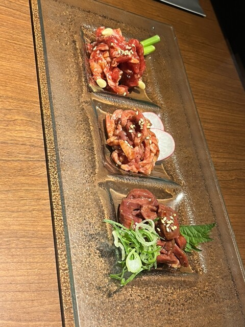 タン五種盛り、ユッケ三種盛り、漬け焼き上ゲタカルビ、焼き野菜盛り合わせ、などを 注文しました。