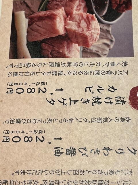 漬け焼き上ゲタカルビ は、少し焼いては タレをつけ、また少し焼いては タレをつけ、というのを重ねて、濃厚な 味わいを 楽しめる一品です。