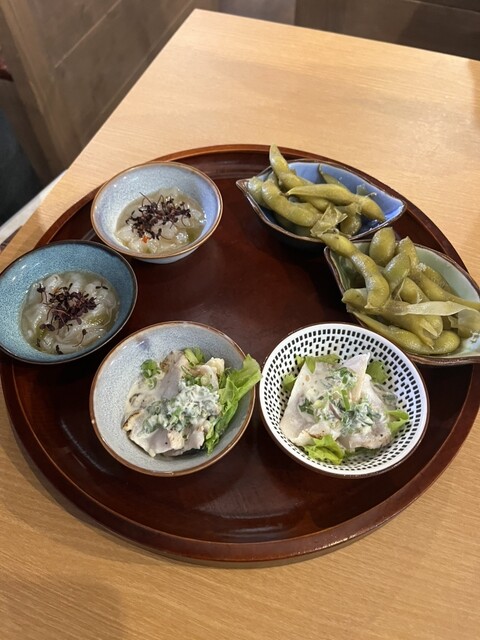 突き出し は、まず 店員さん が 3種類見せてくれて、そこから 一品選ぶ スタイルです。