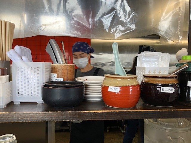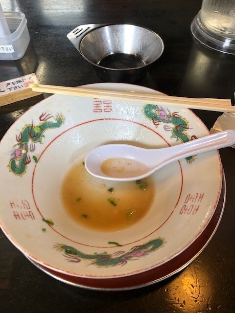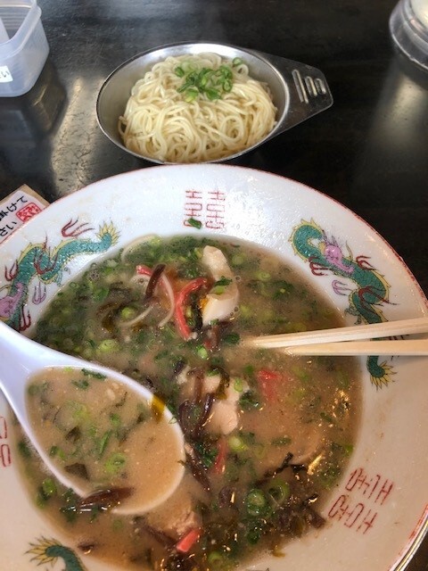 豚骨好きなら、一度は行ってみたい店の1つに来れました。。。この日も午後休で11時に会社を出て11時45分くらいに到着。。路上に既に3台待っていたのでスルーして、Uターンし4台目につけようとしたら前2台がスルスル~っと敷地内に・・・2分ほどして店員が敷地内にどぞ~って言ったので、私も敷地内に入り駐車場が空くのを待機しました。。。やっぱり回転早いなぁ~っと思います。。。さらに2分後くらいに駐車場が空き、すぐさま駐車して店内へGo。名簿に記入し、チャーシューメン煮卵と替え玉を購入。麺の固さと、ネギきくらげの量を○で選んで待機。。。名簿見ると前に30人くらい名前があったので、一旦車に避難。。。今の時期はいいが、真夏や真冬だと車で待機できるのは大変ありがたい。12時半に店内に様子見に行くと、2人目で呼ばれた❕タイミング。食券渡して、水をコップに入れていると、3分くらいで着丼。。味玉こんにちわ。きくらげよろしく。チャーシューも沈んでスタンバイ状態。最初は何も入れずに一気にかき込んでスープもジュルリ。めっちゃおいしぃそしてしょうがを入れてかき込んでスープをジュルリ。。またまたおいしい。麺が無くなる前に『すんませぇ~ん、替え玉』追い麺確定で、生ニンニクすりおろし~の、胡麻すり~の、辛子高菜ぶち込み~の。最後にスープを人回しして、替え玉来ました。もんじゃ入れる器に麺が入って到着。早速器にダイブIN❕2回戦開始と同時に、ごちそうさまでしたぁ~