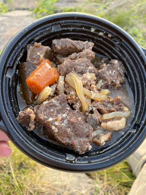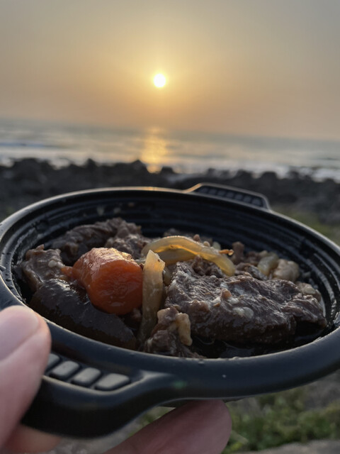 初日は さくらユッケ(70gm 698円)を晩酌のお供に 馬だけにウマイ 他のお客様が馬肉煮込を買われていて とても美味しそうだったので 翌日再訪問今日はコチラを買ってみました。馬肉煮込(300gm 675円)桜肉たっぷりに 牛蒡 太い糸コン 人参 甘じよっぱくてとても美味しかった。他にイオンで酢蛸や煮物を買い足し 道の駅象潟で夕陽を見ながら晩酌です。風が強い日でしたが 夕陽も見れて良い晩酌に成りました。明日は酒田に上陸だ!