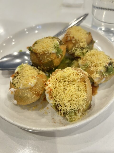 初めて食べたここのダヒプリは、揚げた軽い衣の中にチャツネお野菜と辛めのソース、ヨーグルトに加えて砕いたスナックがかかっている感じでした。