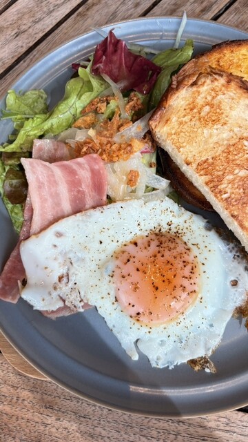 モーニングプレートは新鮮な野菜のサラダとドレッシングが最高で、トーストもベーコンも良かった。