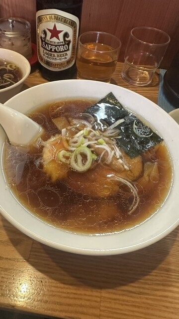 久しぶりにこちらへ。前回は13:30前に行き営業時間ギリギリでハラハラしたが、今日は11:10くらいに到着。もう既に10名以上並んでいた為、入店は11:50位に。前回の反省(量が多く、食べきれなかった)を踏まえ、チャーハンは半チャーハンへ。ワンタンスープをやめ、レバニラ炒めへ。後は前回同様のニラそば、餃子、瓶ビール(大)を注文。まず来たのは、メンマ(ビールのあて)。こちらはチャーシューと煮込んでいるようで、チャーシューの端も入っていた(ラッキー)。ラー油を垂らし、ビールのおつまみに。最高‼️次にレバニラ炒め。醤油ベースの塩味強め、暑い日やお酒、ご飯には良い。濃い目ではある。まってました餃子。私はここの餃子が好き。酢コショウや醤油を付けなくてもしっかり下味がしてあり食べられる。やはり肉肉しく美味しい。こちらもビールに合う。そして、チャーハン。今回は半チャーハン。半チャーハンでも多いと感じる位。しっかりした味付け、チャーシューが濃い味付けの為、ご飯が進む。ニラそばは、熱々。前回同様シンプルな醤油ラーメンに豚とニラもやし炒めが乗っかり、ボリュームでありながら懐かしい味わい。美味しかったです。次は何注文しようかな…ザ町中華。ご家族経営のようで、みなさん良く気づいてくださり、接客も丁寧でよかったです。