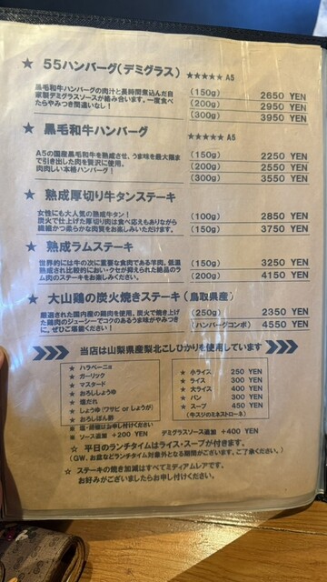 落ち着いた雰囲気の中で、本格的なステーキやハンバーグを楽しめる素敵なお店。観光の合間の食事にもぴったりで、河口湖に来たらまた訪れたいと思える一軒です。