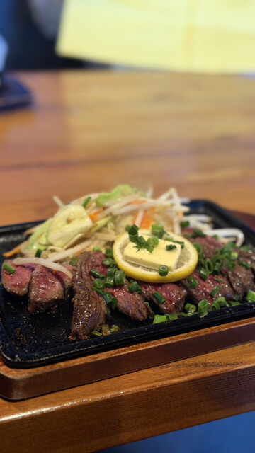 お店の前から漂ってくるステーキの香りに惹かれ、一番人気の「55ステーキ」を注文。脂身が少ないのにとても柔らかく、噛むたびに旨みが広がります。あっさりしていて食べやすく、150gでは正直物足りないくらいでした。
