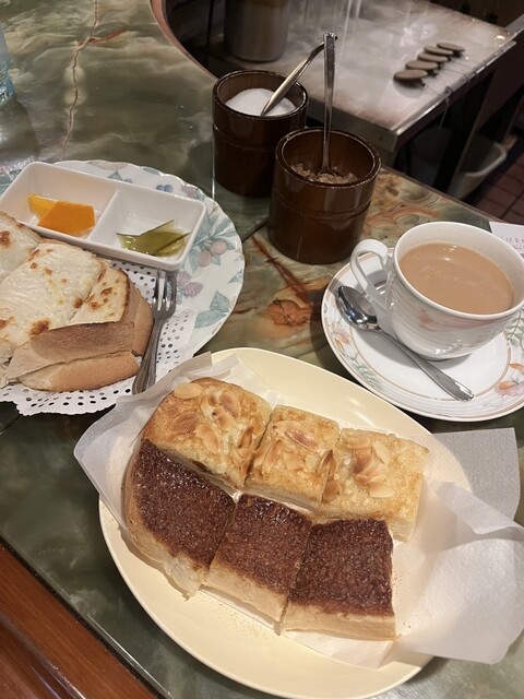 トーストはサクサク。アーモンドスライスが載ったザクザクトーストとシナモンの甘い味わいが絶品。クロックムッシュも美味しかった。
