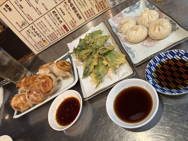 注文したのは餃子、クリームチーズ大葉包揚げ、小籠包、冷やしトマトです。昼ごはんも多めだったので女性2人だとこの4品でちょうど良い量でした。