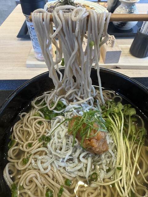 薮蕎麦の梅しらす塩蕎麦は、、、初体験の蕎麦でめちゃくちゃ美味しい。塩ベースの冷たいスープの中に蕎麦が入っていてスープと蕎麦の香りの強い薮蕎麦がとても良くあっている。このようなジャンルの蕎麦ありですね。麺もコシがしっかりとしていて美味しい。